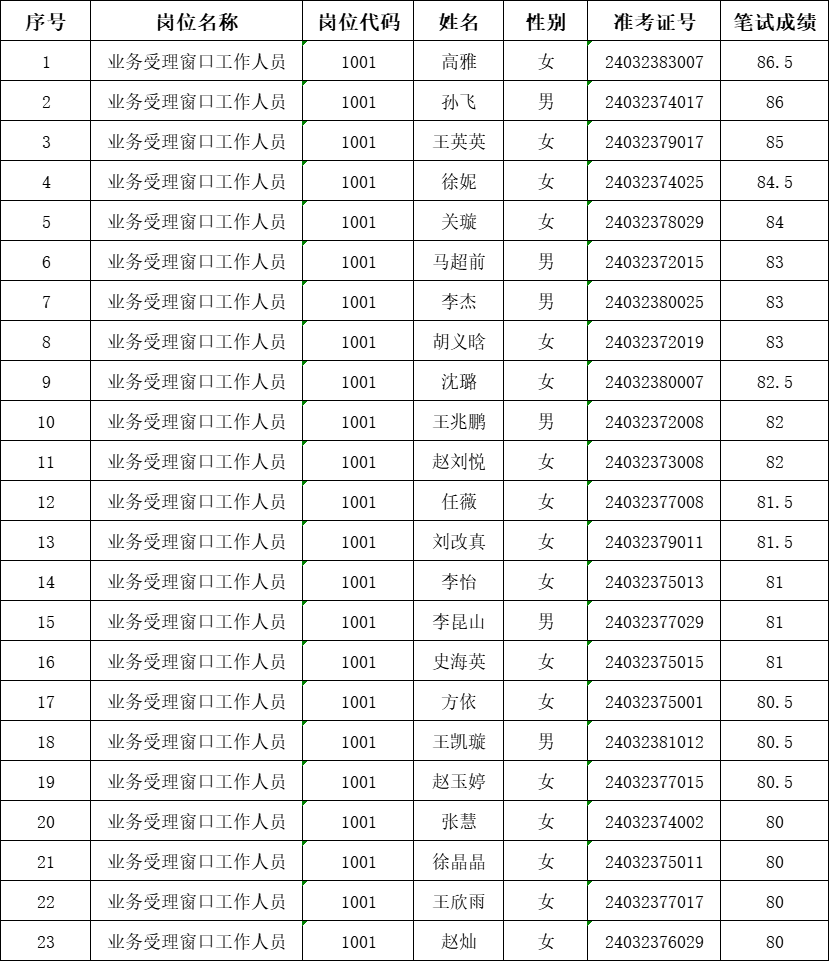 根據筆試成績(jì)由高到低的順序,按照擬招聘崗位數1:2的比例確定進(jìn)入面試人員名單(最后一名出現同分同時(shí)進(jìn)入面試),具體名單如下:
